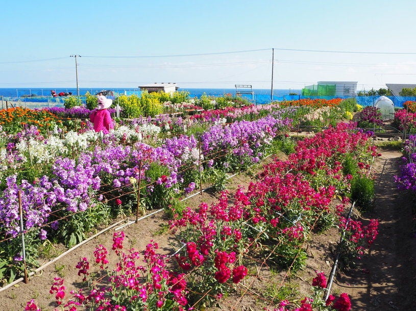 太平洋に面している千葉県南房総市千倉町の白間津地区は一年中温暖な気候が続き冬の時期も霜が降りないエリアです。そんな白間津では温暖な気候を生かしストックやポピー、菜の花など数多くの花々が栽培されています。