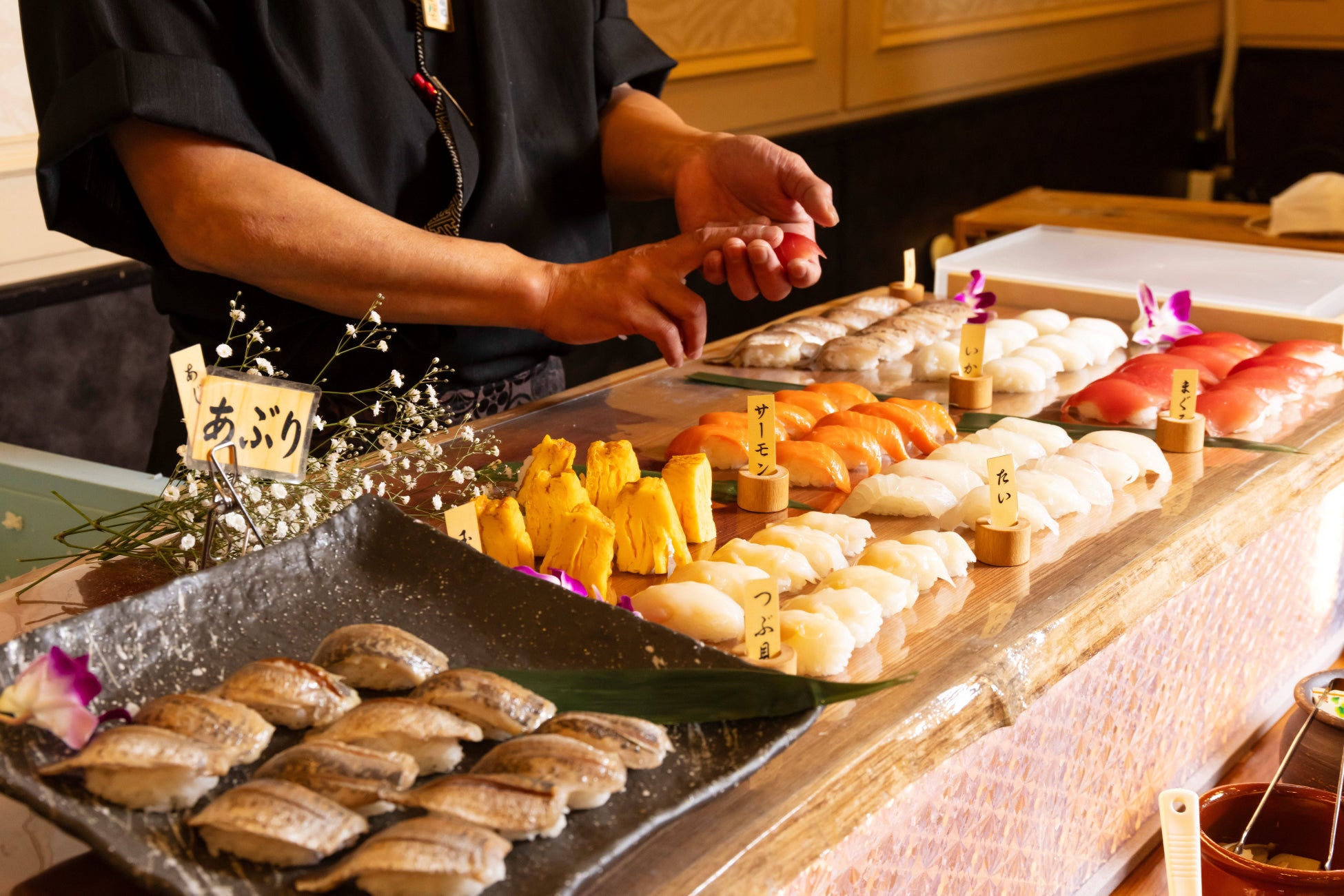 地元の鮮魚を使った5種類以上の握り寿司をはじめ、野菜でシャリを色付けして五色の地層に見立てた、人気の「五地層押し寿司」、郷土料理では、アジを細かくたたきみそや薬味を混ぜた「なめろう」を焼いて食したことが由来の「さんが焼き」がビュッフェに並びます。