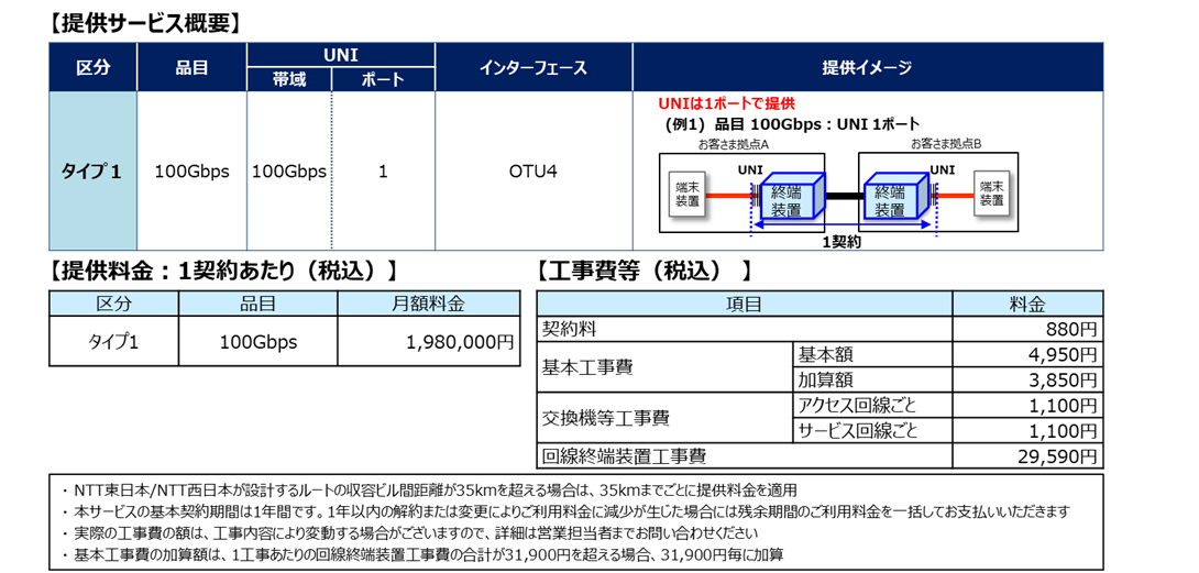 ・このサービスは、現在提供中の高速広帯域アクセスサービス100Gbps(タイプ1)にOTU4のインターフェー