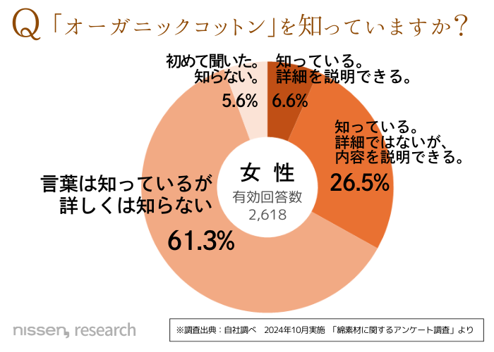 また、『オーガニックコットン』の名称認知度は9割以上と非常に高い結果ですが、内容を説明できるのは全体の3分の1という結果でした。