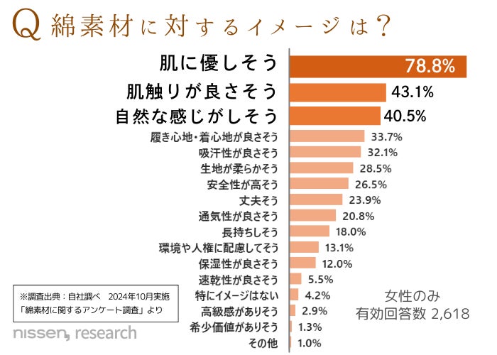 今回の調査では、綿好き派(好き+まあ好き)は88%と大多数で、”肌に優しそう”というイメージを持っているという結果になりました。綿素材は、化学繊維と比較して繊維がやわらかく繊維の端も尖っていないので、肌当たりがチクチクしにくい特性があります。この特性による感触が、”肌に優しそう””肌触りが良さそう”というイメージに繋がっていると思われます。
