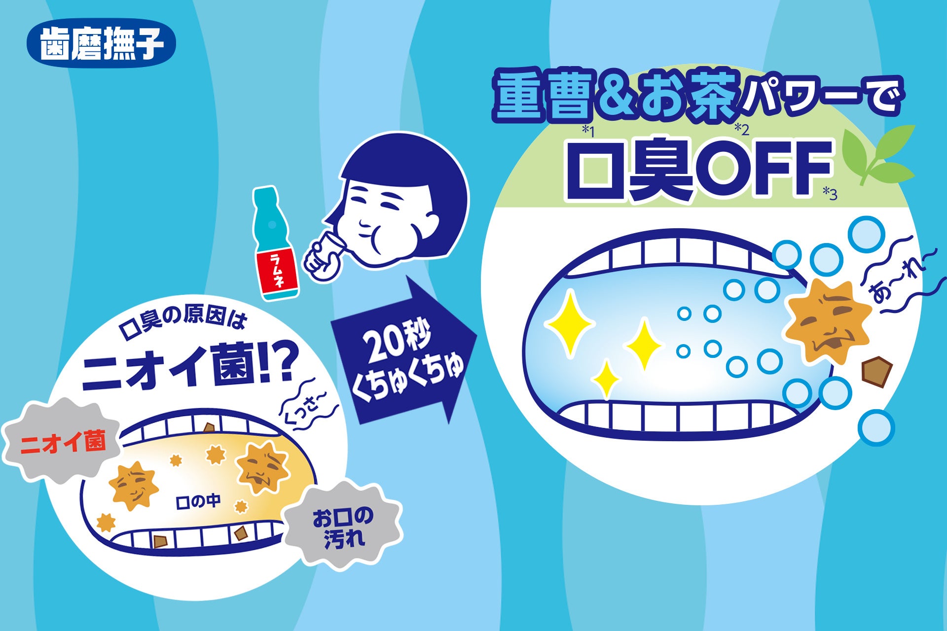約20秒くちゅくちゅすると・・・重曹*1&お茶*2パワーで口臭OFF*3!
