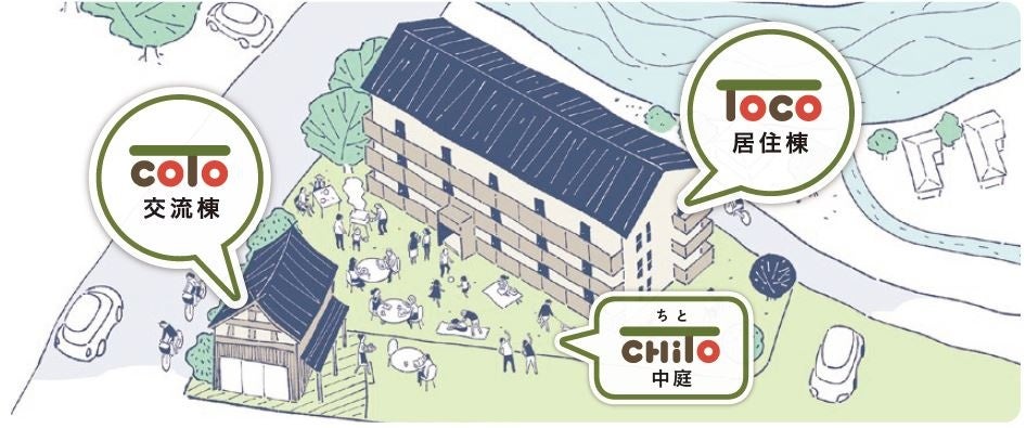 敷地内には、居住棟の「TOCO(とこ)」、交流棟の「COTO(こと)」を建設、さらにイベントや家庭菜園などに使える空間として「CHiTO(ちと)」と名付けた中庭を整備します。交流棟・COTOには、地元企業や移住者が利用できるシェアオフィスやコワーキングスペースを用意し、入居者・地元住民が交流しながら働き、ともに地域をつくっていくための拠点となります。