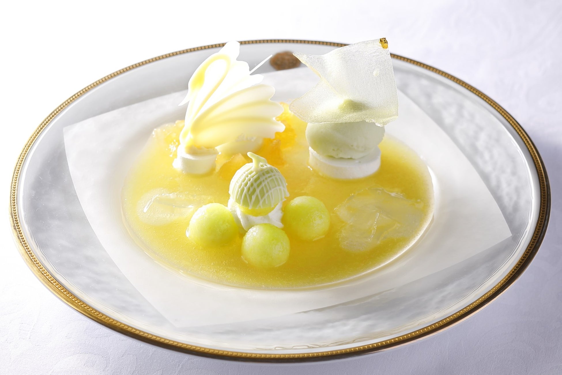 マスクメロンをメインにシャーベットやギモーブ、ムース、ジュレなどさまざまな製法で仕立てました。いろいろな食感をお楽しみください。