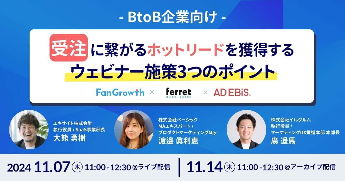BtoBマーケティングのお困りごとをまるっと解決するサービス『ferret(フェレット)』を運営する株式会社ベーシック(本社:東京都千代田区、代表取締役:秋山勝、以下「当社」)は11/7(木)11時より、エキサイト株式会社(本社:東京都港区、代表取締役社長:西條晋一)が主催するカンファレンス「"受注に繋がるホットリードを獲得する"ウェビナー施策3つのポイント」に登壇いたします。