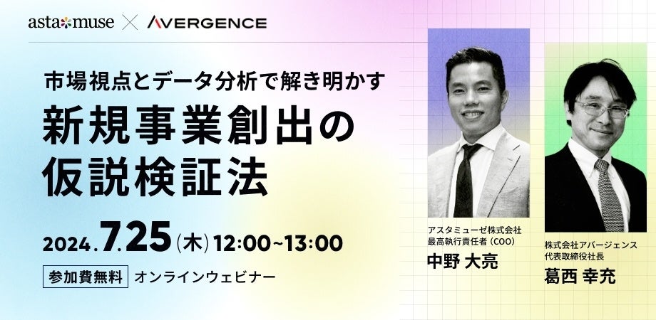 アスタミューゼ株式会社(本社:東京都千代田区、代表取締役社長 永井歩)は、2024年7月25日(木)12:00-13:00に、株式会社アバージェンス(本社:東京都千代田区、代表取締役社長 葛西 幸充)と共同で、新規事業に関する課題解決のヒントとなる無料ウェビナー「市場視点とデータ分析で解き明かす ~新規事業創出の仮説検証法~」を開催いたします。
