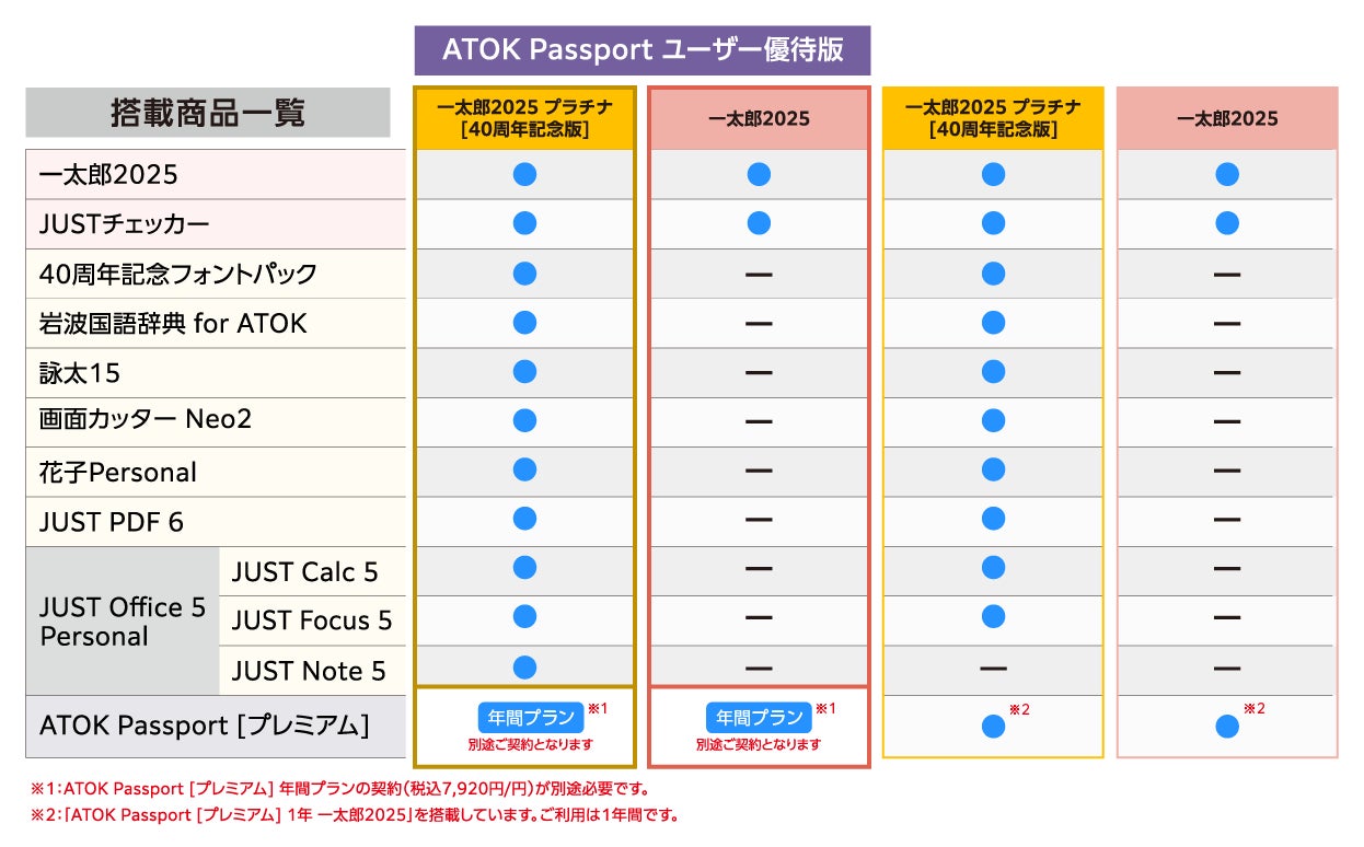 *2 一太郎/JUST Suite/一太郎&花子スペシャルパック/Justsystem Office/一太郎Office/Voice一太郎/ATOK2015~2017 for Windows(各Win&Mac、オールインワンパック含む/for Macは除く)をお持ちの方が対象です。「一太郎2025 プラチナ [40周年記念版]」は対象に花子も含みます。