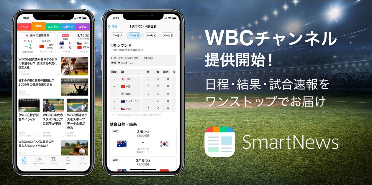 スマートニュース株式会社は、ニュースアプリ「SmartNews」に、3月8日(水)から1次ラウンドが開催される「ワールド・ベースボール・クラシック」(以下WBC)の専用チャンネルを開設しました。