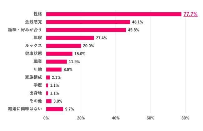 結婚相手に求める要件について尋ねたところ、「性格」が77.7%と最も多く、次いで「金銭感覚」48.1%、「趣味・好みが合う」45.8%と続きました。年収やルックスなどのスペックよりも、人間性や価値観などを重視している人が多い結果となりました。