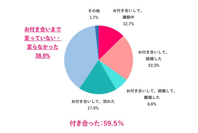 婚活経験のある人に結果について尋ねたところ、「お付き合いまで至っていない・至らなかった」が最も多く38.9%でした。一方で、お付き合いまでに至った人は合わせて59.5%と約6割の人が婚活の結果、お付き合いしていることがわかります。さらに「お付き合いして、結婚した」「お付き合いして、結婚して、離婚した」と回答した人を足すと28.9%となり、約3割の人が結婚にまで至っています。婚活してもすべてうまくいくとは限らないものの、一定の成果は得られている状況も伺えます。