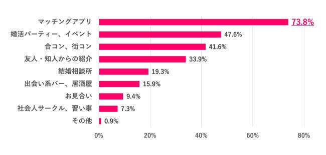 婚活の方法について尋ねたところ、「マッチングアプリ」が73.8%と最も多い結果になりました。次いで「婚活パーティー、イベント」47.6%、「合コン、街コン」41.6%となっており、手軽に相手を探すことのできるアプリや、複数の人に一度に出会えるイベントやコンパなど、効率よく出会うことができる方法が人気であることがわかりました。