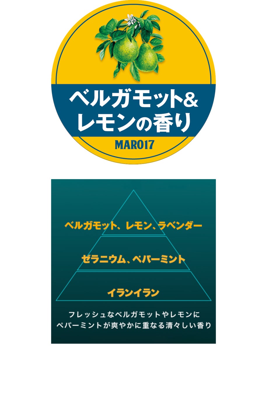 ベルガモットやレモン、ラベンダーの爽やかなトーンに、ハーバルなゼラニウムやペパーミント、ウッディなイランイランを重ね、重厚感がありながらも清々しい、清涼感溢れる香りに仕上げました。
