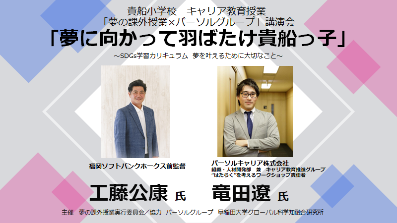 パーソルキャリアの小学校・中学校向けキャリア教育プログラム「“はたらく”を考えるワークショップ」責任者、竜田 遼が、福岡ソフトバンクホークス前監督、工藤 公康 氏と「夢の課題授業」に登壇します。