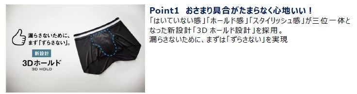 そういった「ちょいモレ」に悩む人たちの想いを受けとめ、長年「ここちよさ」にこだわった商品を作り続けてきたグンゼが取り組んだのが、誰もが抱える可能性がある「ちょいモレ」の不安や悩みを解消、しかも自信をもってはけるパンツの開発です。開発したのは、見た目は普通のボクサーパンツなのに、「モレ」「シミ」「ニオイ」にも対応。「ちょいモレ」対策しながら誰に見られても恥ずかしくないデザインにもこだわったパンツ、その名も「イケオジパンツ」。何歳になっても「かっこよくいたい」そんな男性の願いに寄り添った「イケオジパンツ」が、男性の抱える悩みや不安をスマートに解消します。
