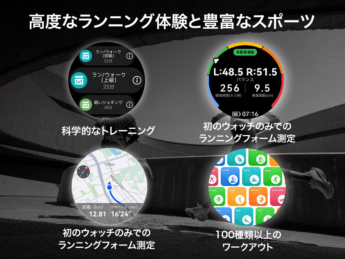 ワークアウト中、ウォッチ画面にフルカラーマップを表示することができるようになりました。自分の位置やルートを、マップ内に印された形で見ることができます。 また、ランニングフォーム分析機能を新搭載。左右の足のバランス、接地時間などの科学的データを提供します。この機能により、あらゆるレベルのランナーがランニングパフォーマンスを向上させ、怪我のリスクを軽減することが可能です。そのほか、ランニング能力指数など様々な項目が測定でき、ランニング中のリアルタイム音声案内などのサポートも万全です。