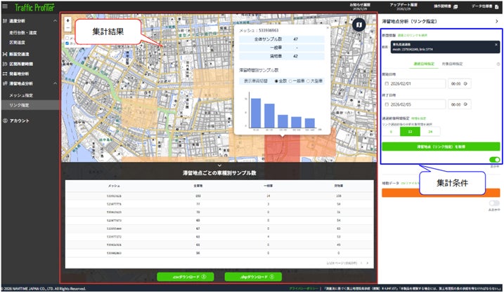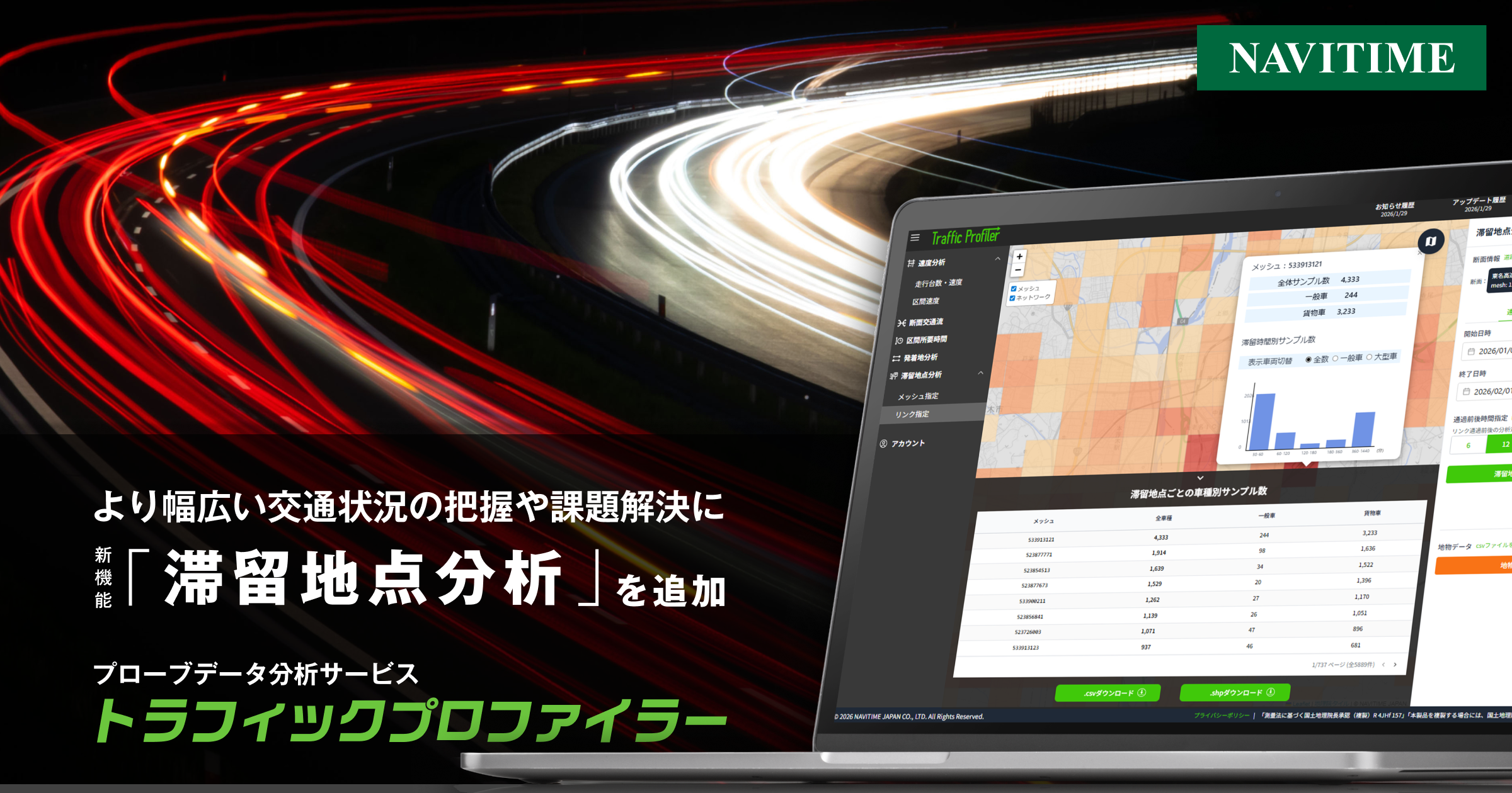 株式会社ナビタイムジャパン(代表取締役社長:大西 啓介、本社:東京都港区)は、2026年2月12日(木)より、「道路プロファイラー」にて、メッシュ毎の滞留状況を分析できる「滞留地点分析」機能を追加し、プローブデータ分析サービス「トラフィックプロファイラー」に名称変更いたします。