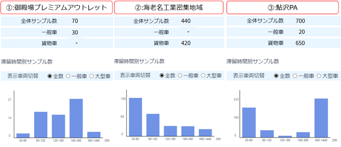 ①(御殿場プレミアムアウトレット)では、一般車の滞留数が大型車より多く、滞留時間も1〜6時間と長時間の滞留が見られます。このことから、買い物利用による滞留であることが推察されます。