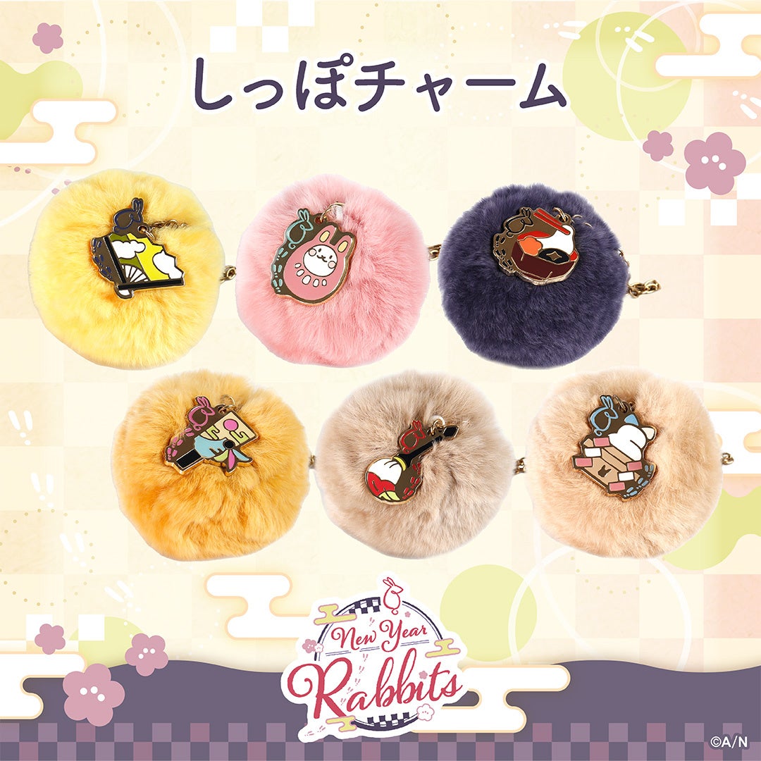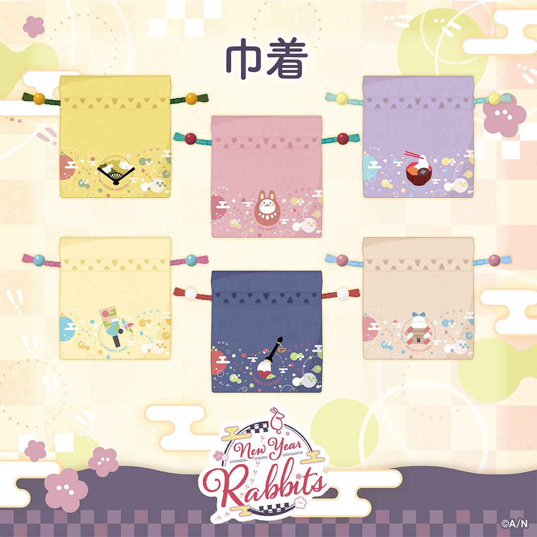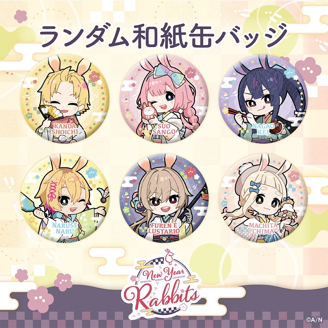 神田笑一、周央サンゴ、長尾景、成瀬鳴、フレン・E・ルスタリオ、町田ちま6名のライバーが参加する「New Year Rabbits」グッズのラインナップは、ランダム和紙缶バッジ、ゆらゆらアクリルスタンド、年賀状風ポストカード、巾着、しっぽチャームの5種類。