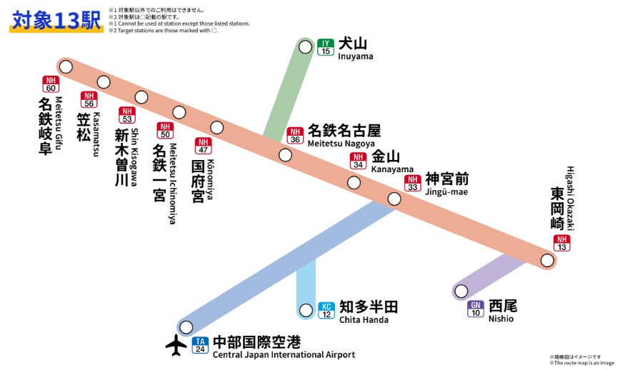 実証実験中の中部国際空港駅(※)、名鉄名古屋駅(※)、金山駅(※)、の3駅と合わせて、計13駅