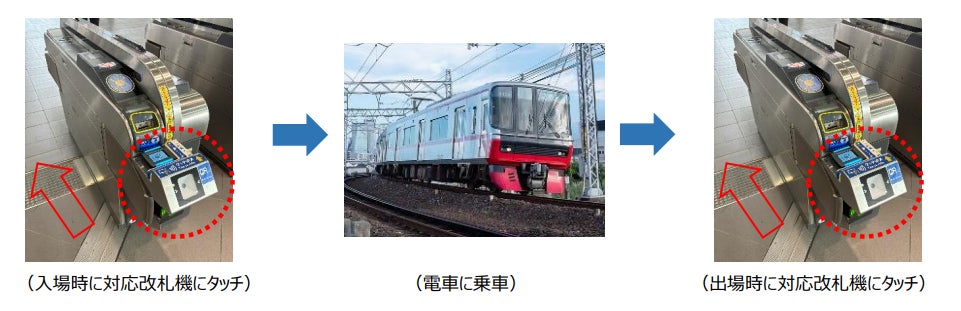 お手持ちのタッチ決済対応のカード(クレジット・デビット・プリペイド)や、同カードが設定されたスマートフォン等を、タッチ決済対応改札機に入場時と出場時にかざすことで電車をご利用できます。