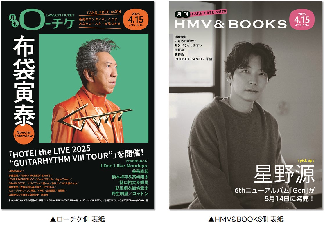 『月刊ローチケ』の表紙は、全国ツアー『HOTEI the LIVE 2025 "GUITARHYTHM VIII TOUR"』を開催する「布袋寅泰」。そして『月刊HMV&BOOKS』の表紙には、6年半ぶりのニューアルバム『GEN』を5月14日(水)に発売する「星野源」が登場!