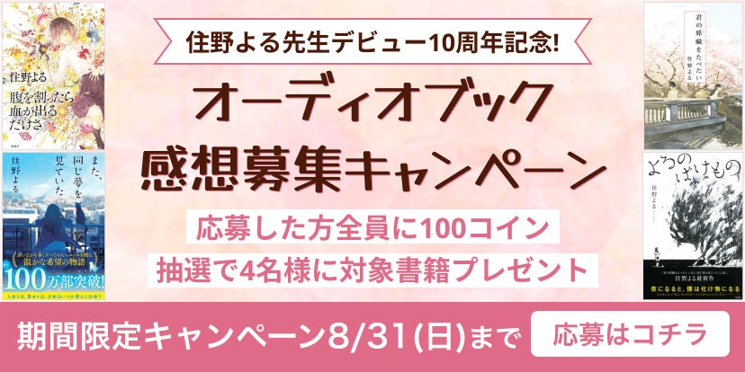 2015年に刊行されたデビュー作『君の膵臓をたべたい』は累計発行部数300万部を突破し、その後の作品も映画化・舞台化などのメディアミックスを通じて大きな反響を呼んできました。 audiobook.jpにおいても、住野よるさんの作品は多くの方にお楽しみいただいており、オーディオブックという新しい読書体験の入口として選ばれることも少なくありません。デビュー10周年を迎える本年、audiobook.jpでは、住野よるさんの作品世界を耳で読むというかたちでさらに多くの方にお楽しみいただく機会を創出すべく、本キャンペーンを実施いたします。