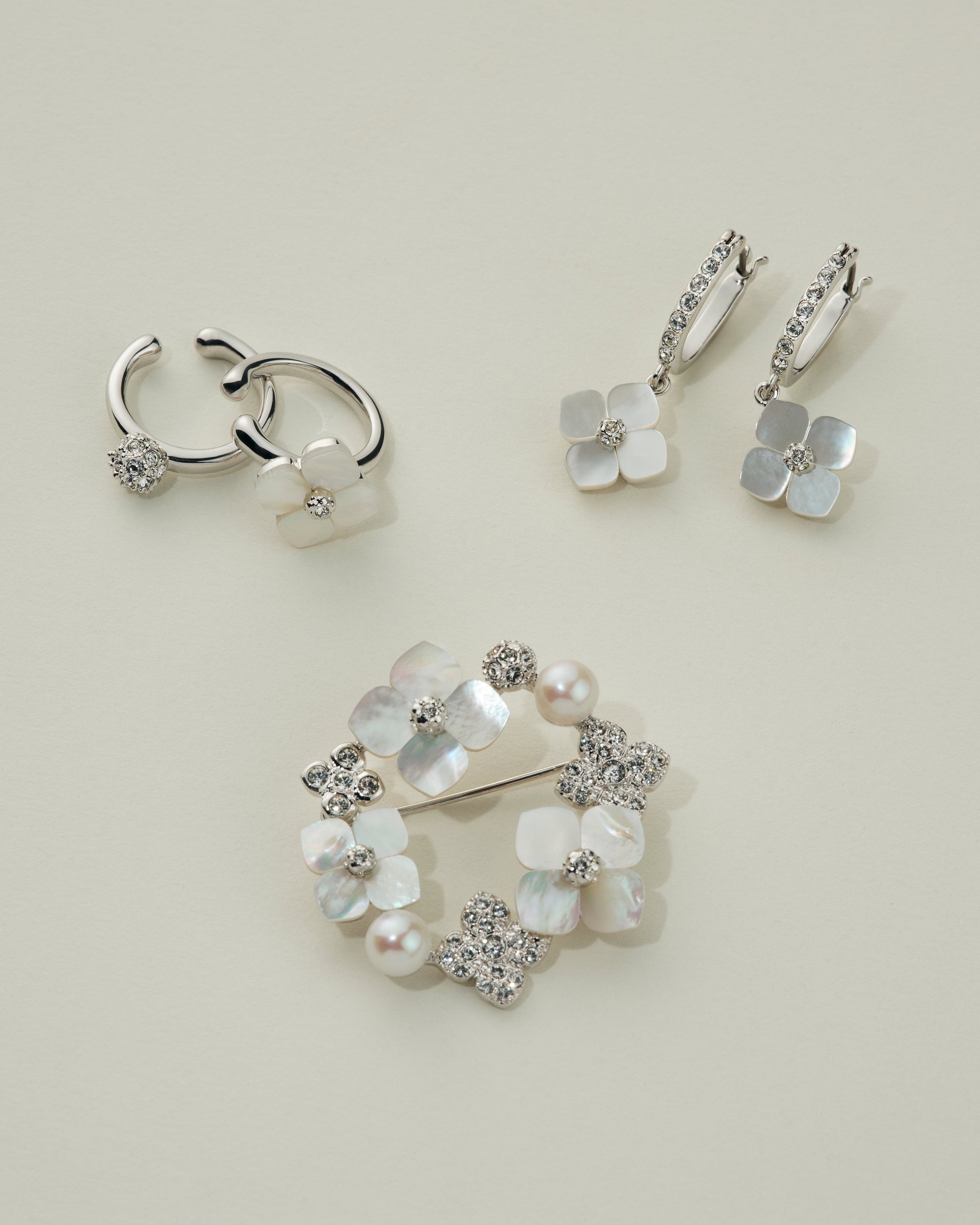 上品な輝きで顔周りを華やかに引き立てるヴァンドームブティックのブローチ。質の良い白蝶貝を1つ1つ丁寧にかたどった可憐な花モチーフのコレクションより新作ブローチが登場。白蝶貝特有のゆらめく虹彩に、パールの優しくしっとりとした輝き、繊細に散りばめたカットガラスの硬質な煌めきと、上質な素材の輝きが響き合い、装いに奥深い魅力を加えます。ハレの日はもちろん、いつもの装いをさり気なくクラスアップしてくれるアイテムです。