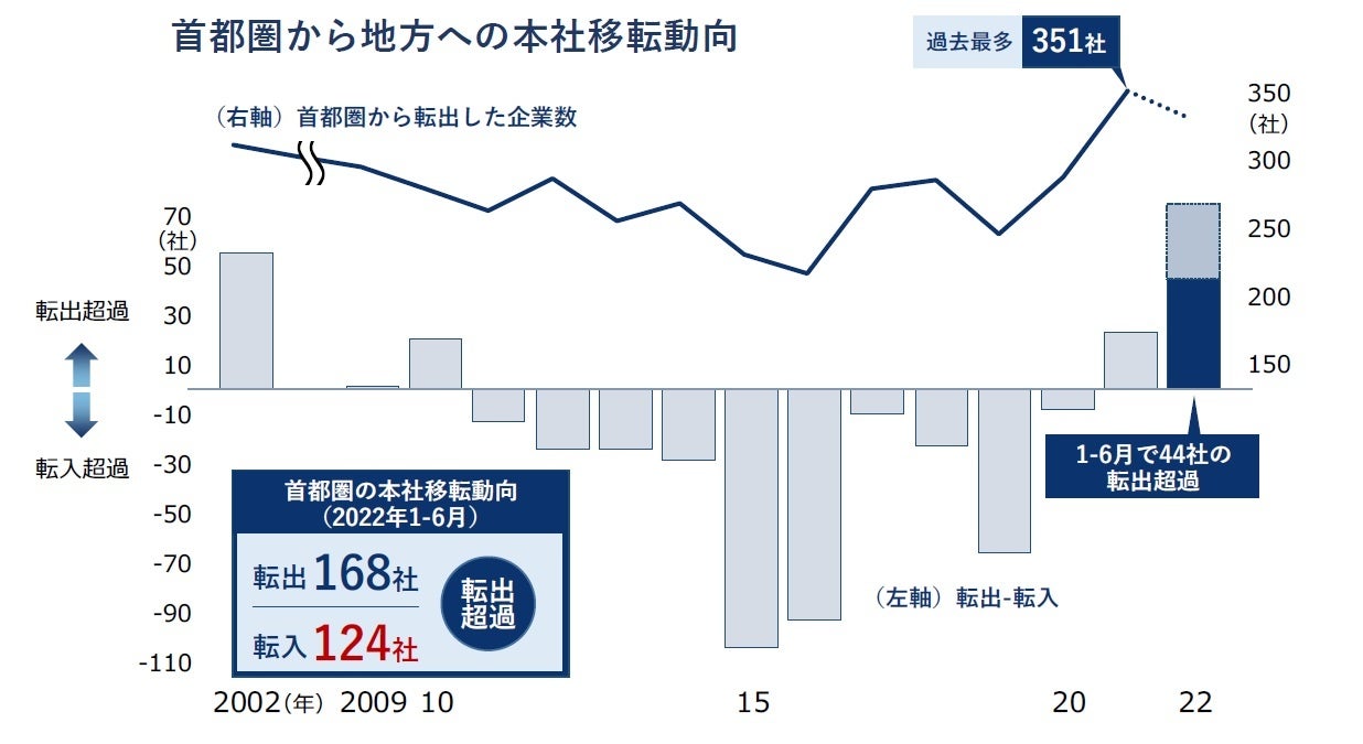 この結果、2022年1-6月における首都圏への本社移転動向は、転出企業が転入企業を44社上回る「転出超過」となったほか、前年同時期(14社)に比べて大幅に増加した。このペースで推移した場合、22年通年の転出超過社数は70社を超える可能性が高い。この水準は、2001年(転出超過:92社)以来20年ぶりの水準となる。