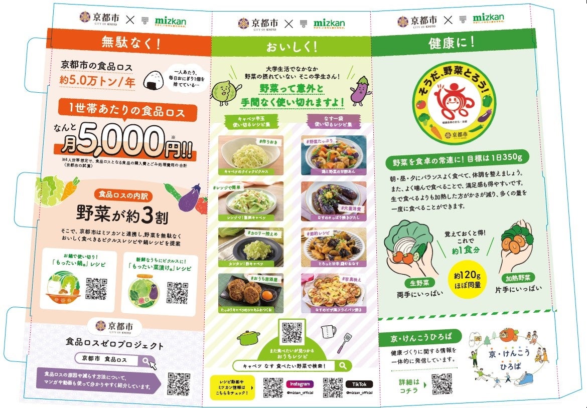 今年度は、健康長寿企画課と資源循環推進課の皆様と「ともに」、食育月間である6月に京都市で実施される「そうだ、野菜とろう!」キャンペーンの一環として、約30の大学へ卓上3面POPを送付し、学生食堂などへの設置を依頼します。卓上3面POPで、「もったい菜漬け」レシピなど、手軽においしく野菜が摂取できるメニューの紹介を通じて、「無駄なく!おいしく!健康に!」をキャッチフレーズに「野菜摂取による健康づくり」と「食品ロス削減」を若者世代にPRします。