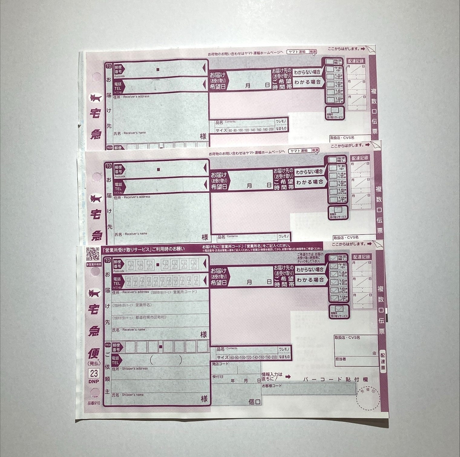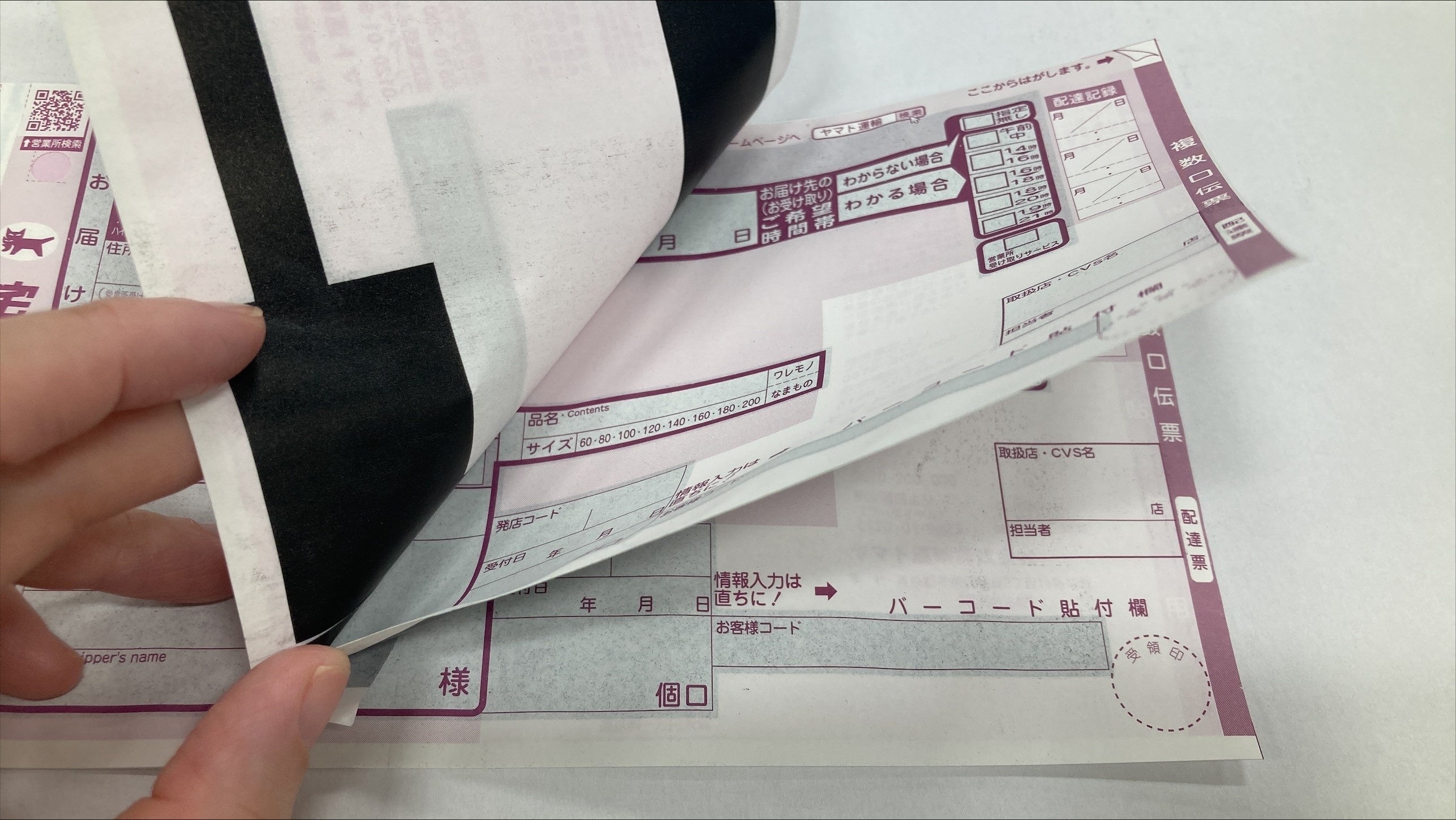 (左)複数口伝票のイメージ、(右)1つづりの複数口伝票を分けて、複数の荷物に貼り付けることができる。
