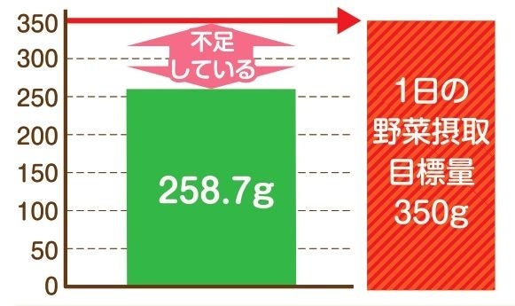 野菜摂取量の目標量は1日350g以上ですが、国民健康・栄養調査(令和6年)によると、野菜摂取量は平均(20歳以上)で258.7gと、100g程度足りていないという結果でした。