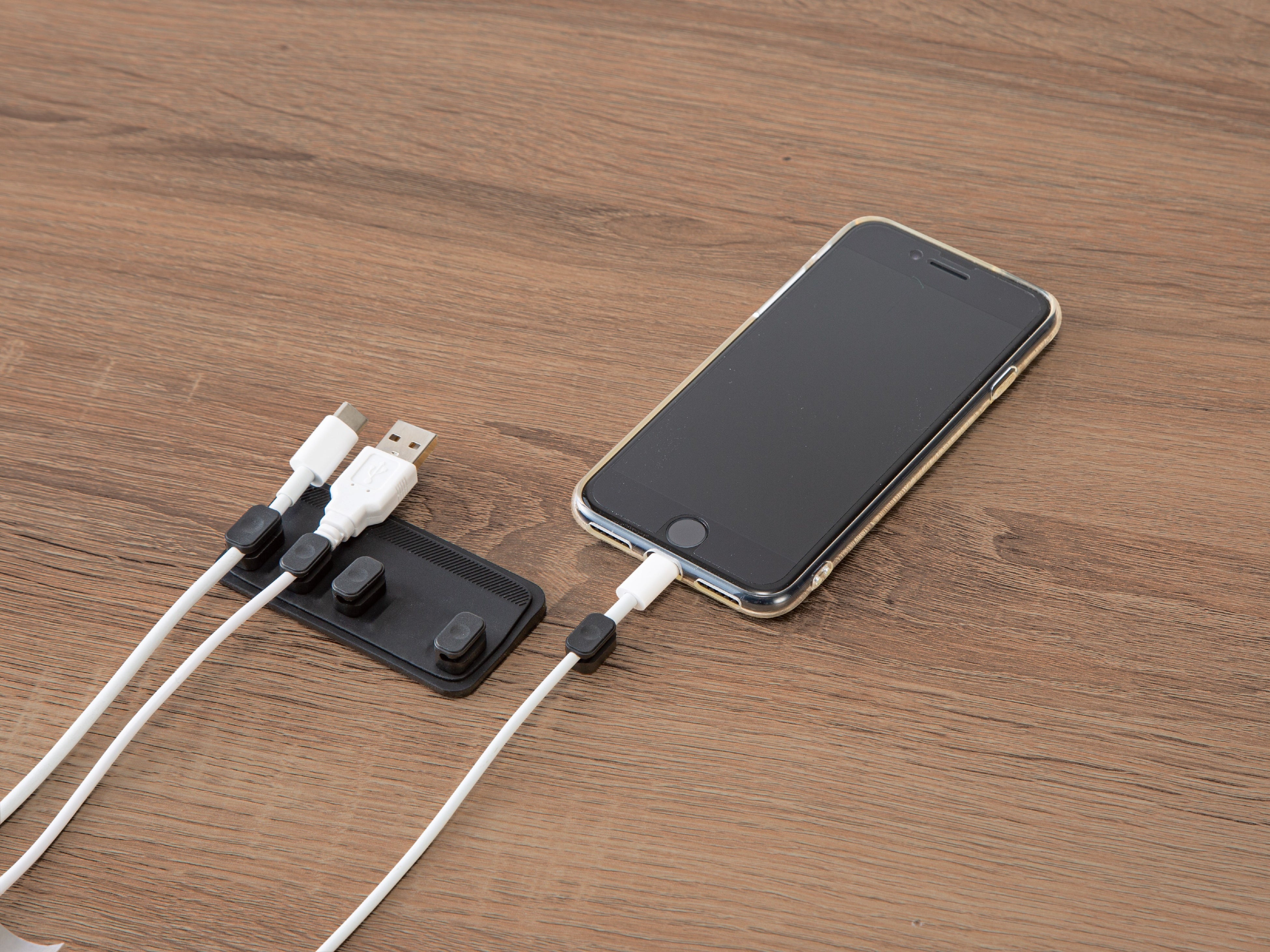 ベースと5個のホルダーそれぞれにマグネットを内蔵。充電ケーブルにホルダーをセットしてベースにくっつけると、磁石の力で固定されるため落ちにくくなります。コードの定位置が決まるので、使いたい時に探す手間が省けて大変便利です。