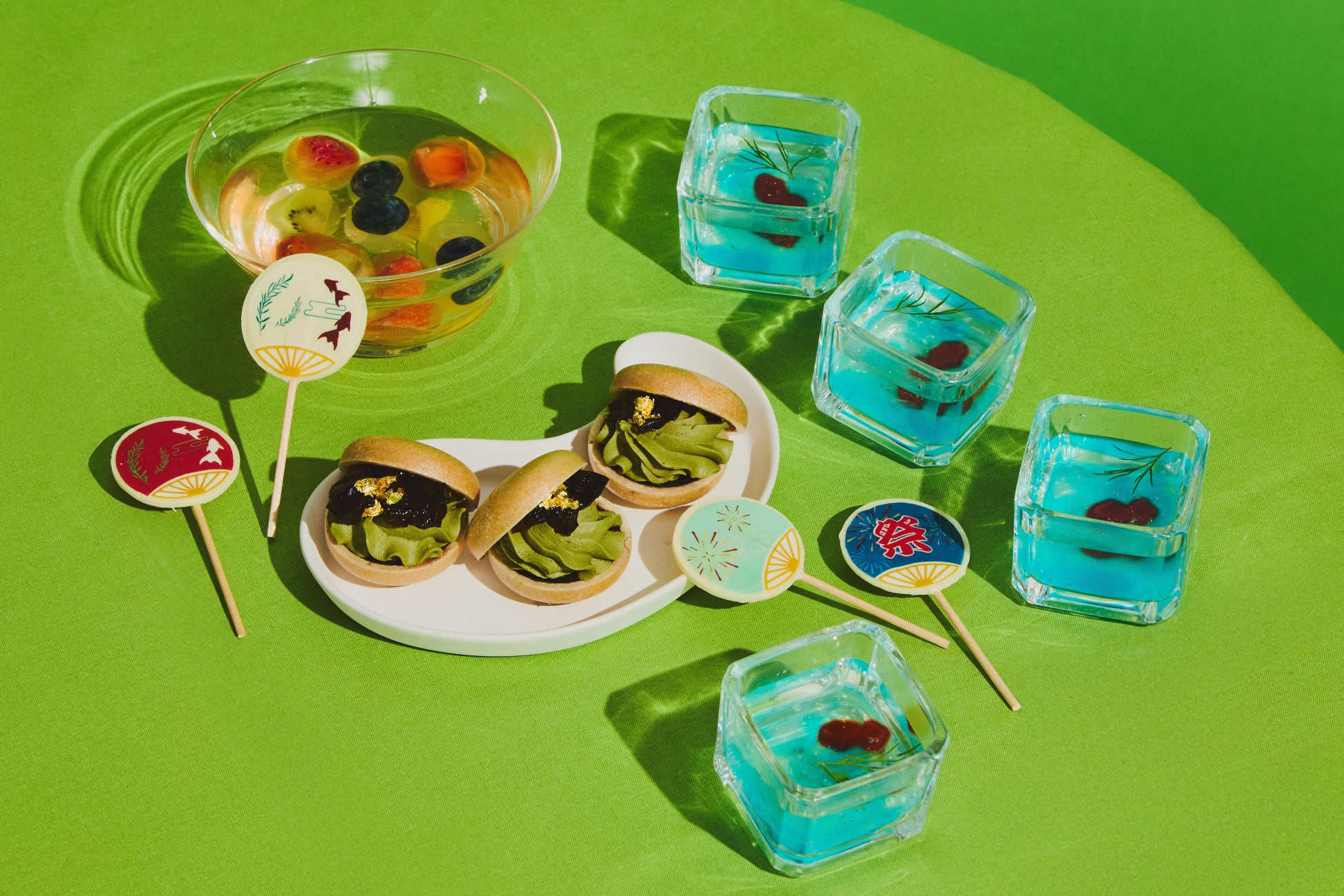 涼しげなブルーが印象的な「金魚鉢風ゼリー」や、「スーパーボール」に見立てた丸いフルーツゼリー、和風のデザインがあしらわれた「うちわチョコレート」など、夏祭りや日本の夏の風景にインスパイアされた和スイーツをご用意。
