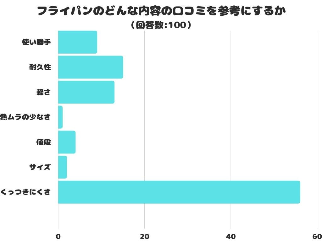 フライパンのどんな内容の口コミを参考にするかをアンケートにて調査したところ、1位は「くっつきにくさ」でした。