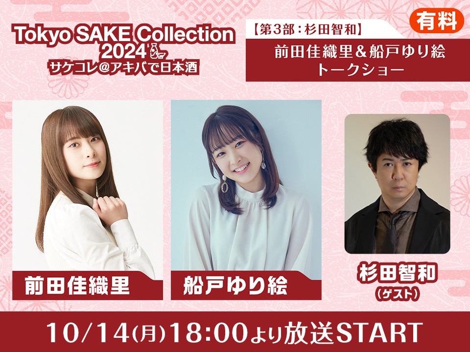 サケコレは、日本酒に触れる機会の少ない若い層や、海外の方に日本酒の魅力を発信することを目的とした日本酒イベントで、東京・秋葉原にて3日間にわたって開催されます。そんな日本酒好きの日本酒のためのイベントの最終日に、声優で大のお酒好きとしても知られる前田佳織里と船戸ゆり絵をMCに迎え、ゲストにも声優を招いた、3部構成のトークショーが行われます。ゲストには、第1部に和泉風花、第2部に長谷川玲奈、第3部に杉田智和が登場。お酒好きの声優たちが、日本酒愛にあふれたトークを繰り広げる様子をお届けします。