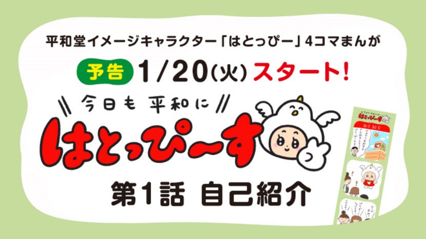 株式会社平和堂(本社:滋賀県彦根市、代表取締役社長執行役員CEO:平松正嗣)は、平和堂イメージキャラクター「はとっぴー」の認知向上を目指す「はとっぴーだいすき!プロジェクト」として、2026年1月20日(火)より、はとっぴーの日常を描く平和堂オリジナル4コマまんが『はとっぴ~す』の配信を開始します。