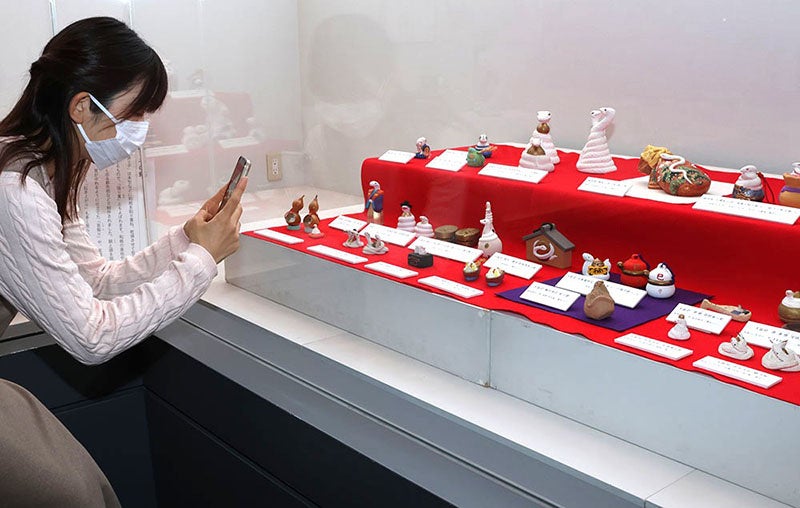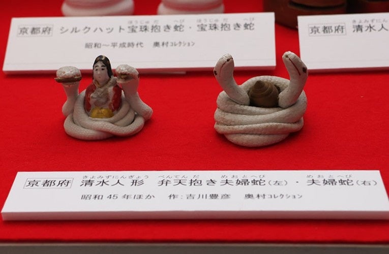 同館では、収集家などから寄贈された約3万点もの郷土玩具を収蔵。「干支にまつわる作品を見て、お正月の気分を楽しんでいただきたい」という思いから、その郷土玩具を活用し、十二支や新年の干支にちなんだ展示を例年実施しています。今年は、令和7年の干支「巳(み)」にちなみ、蛇をテーマにした、粘土を焼いて作る土人形や土鈴、型に和紙を貼り重ね立体的に成形する張り子などの作品を約60点展示しています。中でも、京都市清水坂周辺で土産物とされていた清水人形の「弁天抱き夫婦蛇」に注目。土人形の多くは型を使って作られますが、本作品は型を使わずに手で粘土をひねったりつまんだりして造形した「ひねり人形」で、ひねり人形ならではの自由でやわらかな表現が魅力です。夫婦和合を象徴する2匹の蛇が、蛇を使いとする水の神・弁財天を囲むように絡み合っていて、縦約4センチメートル×横約5センチメートルほどの掌に乗る大きさです。他にも、新潟県の白山神社境内の大松に宿るとされる「蛇松の精」を表現した授与品の土人形「蛇松明神 蛇三体」、和歌山県・道成寺の参詣土産で釣鐘に巻き付く蛇をかたどり「娘道成寺」の物語を表現した張り子「吊り物 道成寺の釣鐘」など、蛇にまつわる作品が展示されています。同館担当者は、「蛇は金運を招くと言われています。お越しいただいた皆さんにとって、来年が豊かな年になりますように」と話しています。この日、同館を訪れた来館者は、気に入った土人形を写真に収めながら展示を楽しんでいました。