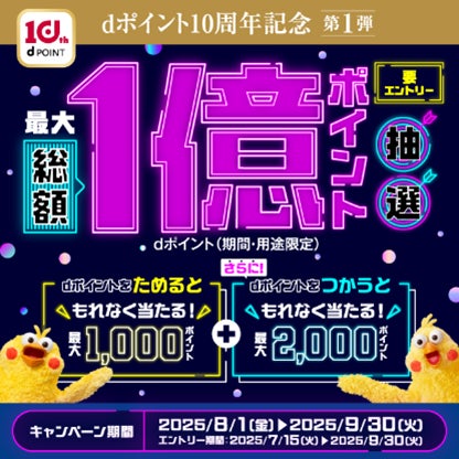 10周年記念キャンペーンの第一弾として、2025年7月15日(火)から2025年9月30日(火)まで、 dポイントをつかう・ためることでdポイントが当たる「最大総額1億ポイント抽選」キャンペーン(以下、第一弾 キャンペーン)を開催※2します。