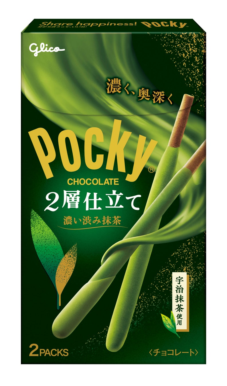 抹茶の風味を引き出したチョコレートを丁寧に重ねることで実現した、濃く奥深い味わいのポッキー 「ポッキー2層仕立て<濃い渋み抹茶>」 5月20日(火)より発売