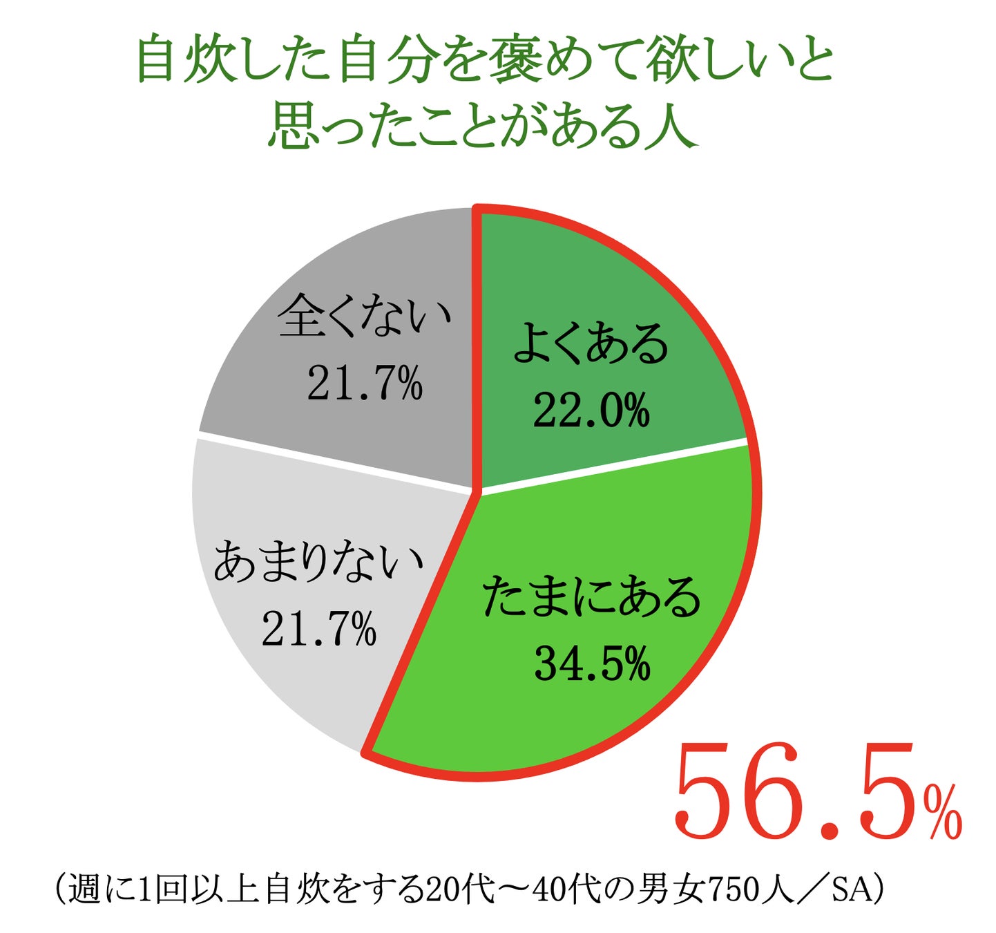 また、56.5%の人が自炊をした自分を褒めてほしいと思ったことがあり、38.7%の人が自炊をしていることに対して「褒め」が足りないと感じています。