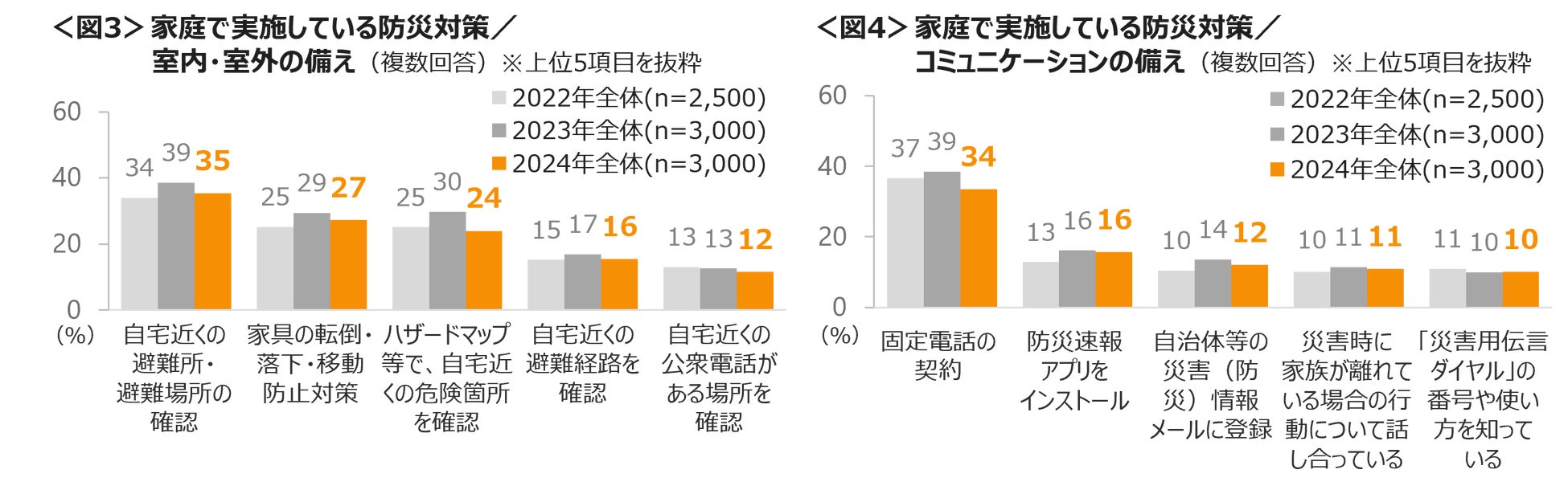 ”室内・室外の備え”は、「避難所・避難場所の確認」、”コミュニケーションの備え”では「固定電話の契約」が3割台でTOPにあがった。<図3・4>