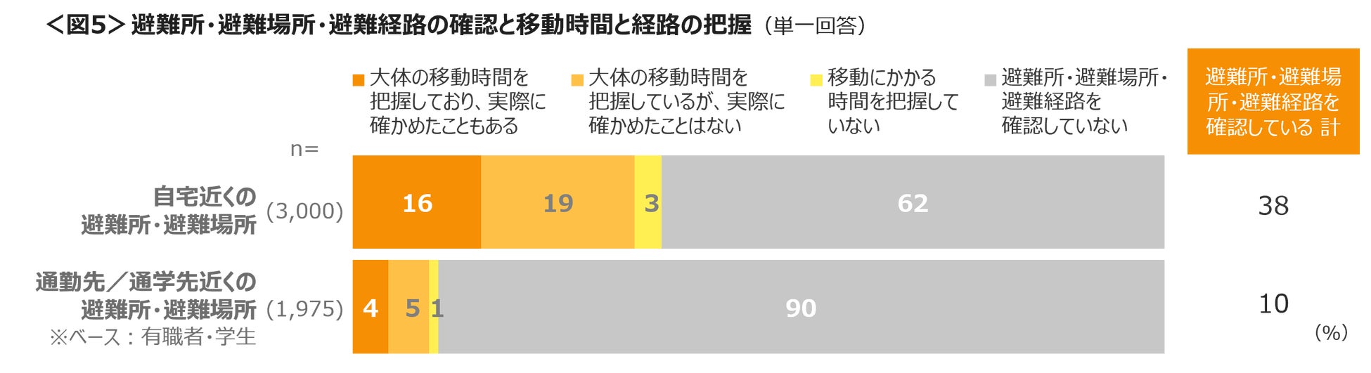 最寄りの避難所・避難場所・避難経路の確認の有無と実際に歩いて時間や経路を確認したかを聴取した。自宅近くは、場所を確認している人が38%でそのうち「大体の移動時間を把握しているが、実際に確かめたことはない」が19%、「大体の移動時間を把握しており、実際に確かめたこともある」が16%であった。有職者と学生において、勤務先/通学先近くの場所の確認は、10%と非常に少ない。場所を確認していない人は、自宅近くで62%、通勤先/通学先近くが90%であり、大災害が起きた場合、いち早く逃げることができるのかが懸念される。<図5>