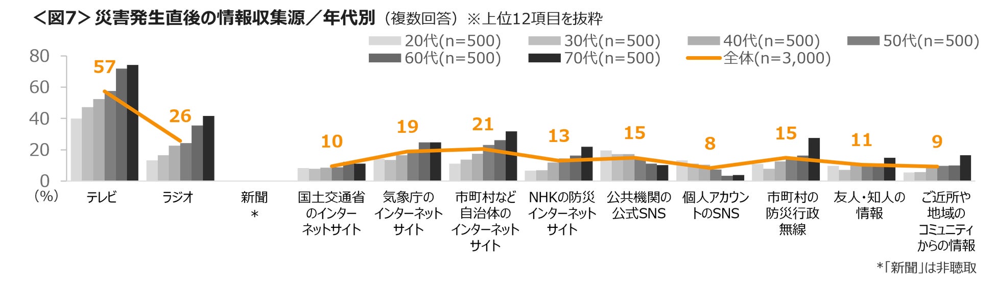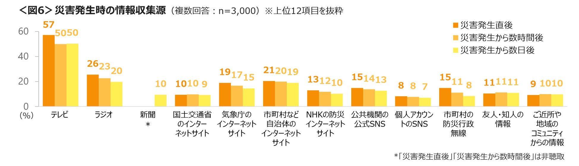 災害発生時、発生から数時間後、発生から数日後の情報収集源について確認した。発生時から数日後まで「テレビ」が最も高く、「ラジオ」「市町村など自治体のインターネットサイト」「気象庁のインターネットサイト」が続く。<図6>