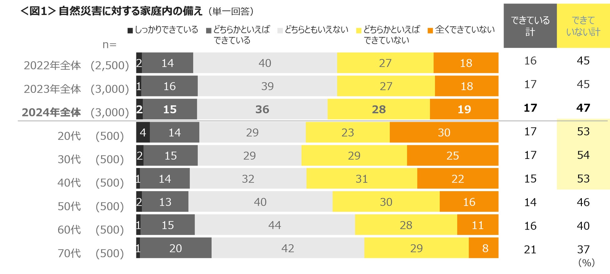 災害に対する家庭内の備えを5段階で聴取した結果、「できている計」は17%にとどまり、「できていない計」は47%と半数近くを占めた。20代~40代は備えができていない割合が半数を超えた。この3年間の結果をみても災害への備えができている人は低調のままである。<図1>