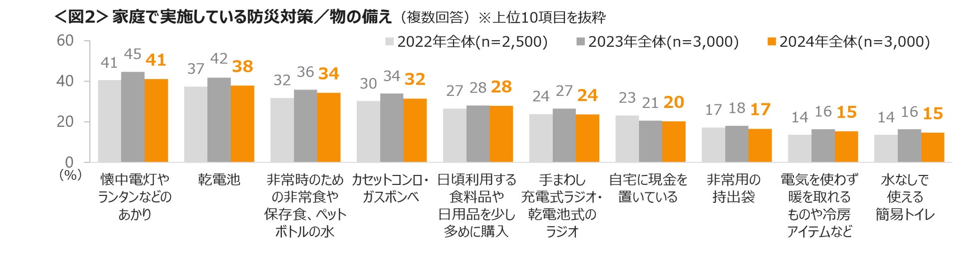 防災対策として”物の備え”では、「懐中電灯やランタン」4割台、「乾電池」「非常食・保存食・ペットボトルの水」「カセットコンロ・ガスボンベ」が3割台であり、3年間で大きな変わりはない。<図2>