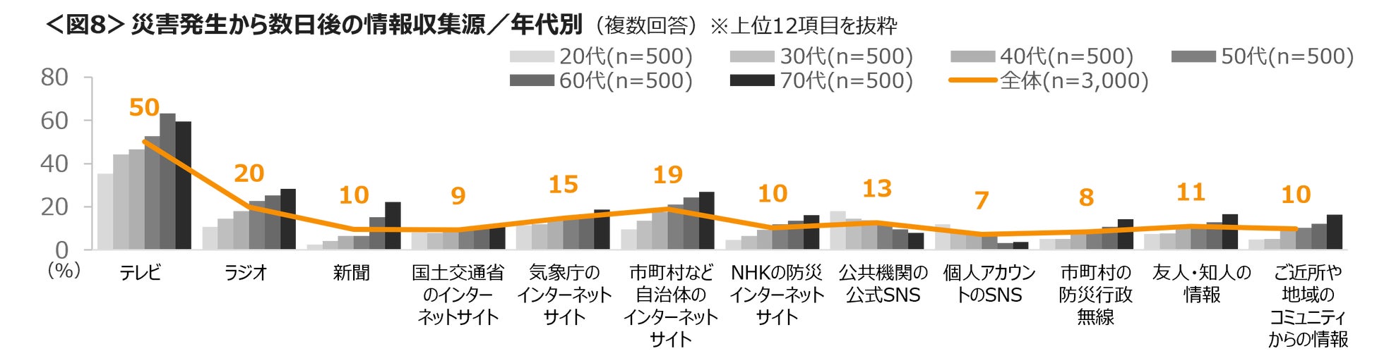 テレビやラジオ、新聞の媒体、気象庁・自治体・NHKの防災などのインターネットサイトや防災行政無線、コミュニティからの情報収集は年代があがるほど高まる。一方、年代が若いほど、公共機関、個人アカウントのSNSによる情報収集が多くなっている。<図7・8>
