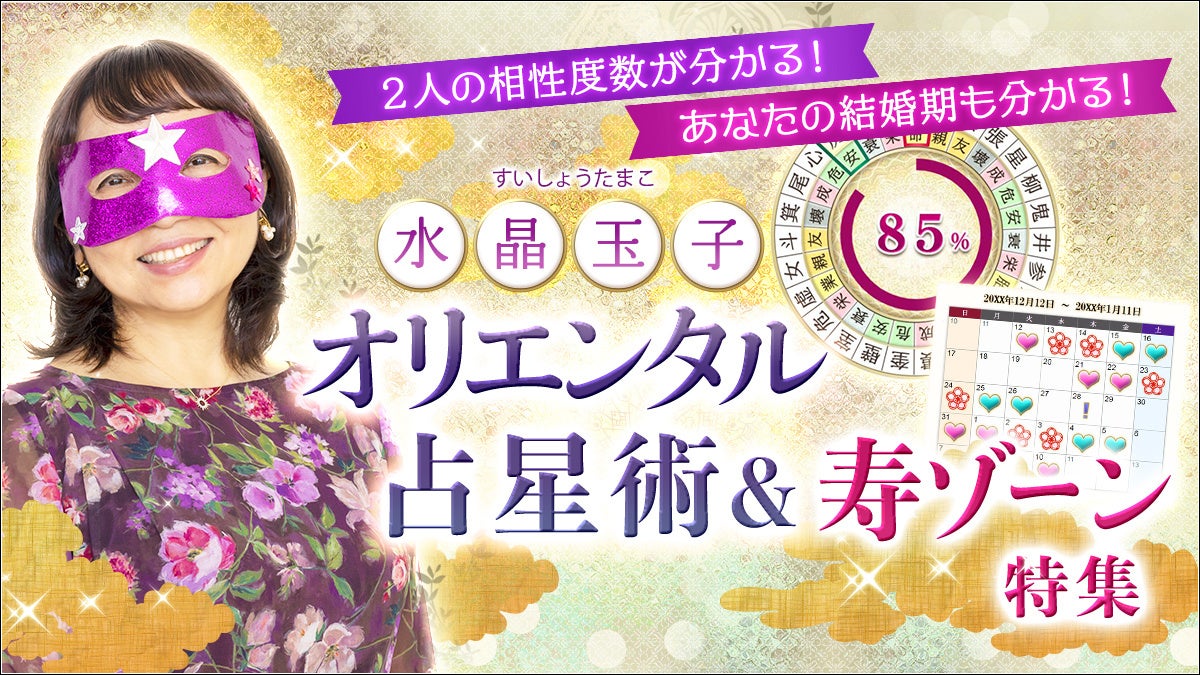 この特集は、相性占いが得意な「究極のオリエンタル占星術」と結婚期を占える「寿ゾーン占い」といった水晶玉子先生の人気の占いを楽しめる特別企画です。