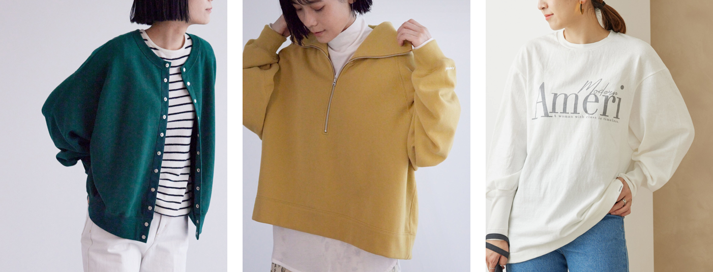 左:2WAY スナップロゴカーディガン(GREEN・PINK BROWN・GRAY)