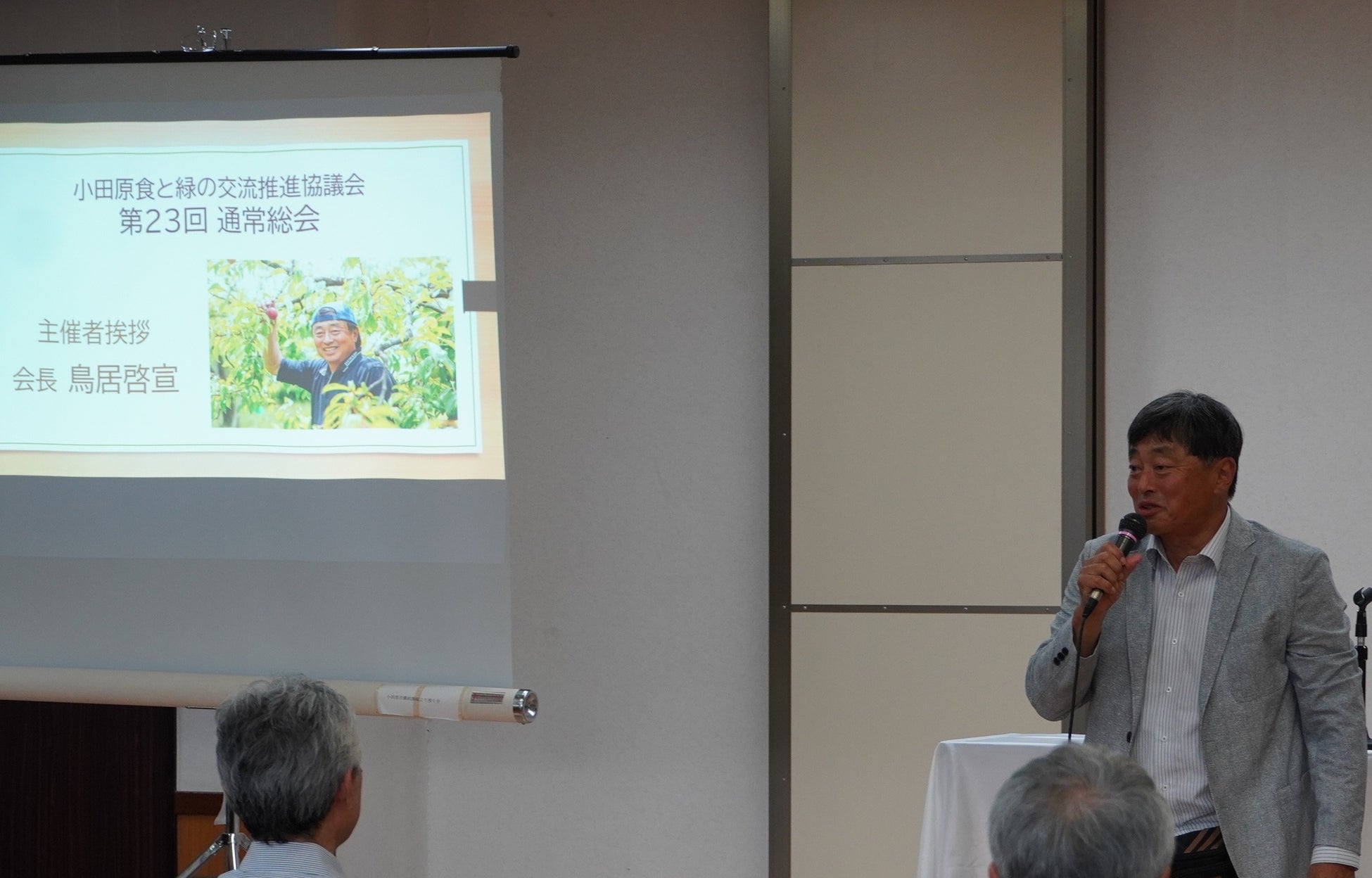 議案承認の後、鳥居啓宣協議会会長は、「2002年の協議会設立当初に比べると、社会や農業を取り巻く環境は大きく変わってきています。立場を超えて支え合うつながりが大切です。ともに持続可能な社会づくりをすすめていきましょう」とあいさつしました。