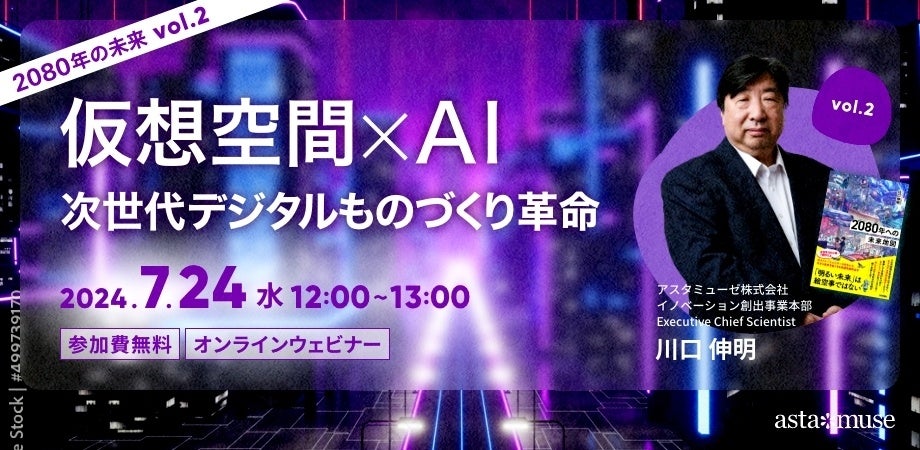 アスタミューゼ株式会社(本社:東京都千代田区、代表取締役社長 永井歩)は、2024年7月24日(水)12:00-13:00に、『2060 未来創造の白地図』および『2080年への未来地図』著者、弊社のExecutive Chief Scientistである川口伸明による無料ウェビナー「仮想空間×AI:次世代デジタルものづくり革命 ~2080年の未来シリーズvol.2~」を開催いたします。書籍に取り上げた技術領域や社会課題、未来世界について語るウェビナーです。